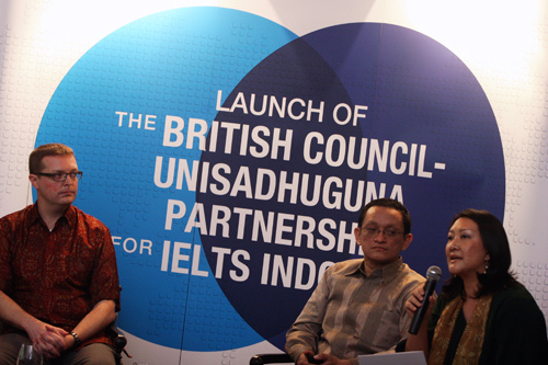 David Whitehead, Head Of English Language Development British Council, Windiaprana Ramelan, Higher Educatioin and Testing Programme Director USG sedang mendengarkan penjelasan dari Mariam Kartikatresni dari The British Institute (TBI) IELTS pada acara Peluncuran Kemitraan British Council dan UniSadhuGuna untuk IELTS Indonesia di Jakarta (30/05). [British Council Jakarta : 20120530]