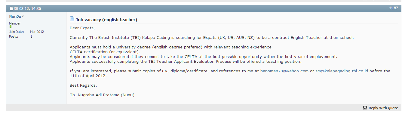 TBI Kelapa Gading on a Mass Recruitment Drive (March 2012) (Screen Dump #9) tbilanguageschool / January 9, 2013 Nunu scrambling for teachers Share this: Click to share on X (Opens in new window) X Click to share on Facebook (Opens in new window) Facebook Like Loading...