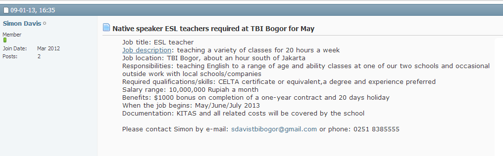 When you consider that EF offers accommodation and pays Rp 7.5 million, this really isn’t any more than EF pays, is it? The value of the room provided by EF would be, conservatively, Rp 1.5 million a month, so really TBI pays little more than EF at most of its franchise schools. TBI Bogor’s 10 million does not include any accommodation. Please do not believe that TBI pays anything like as much as Wall Street at most branches. It actually competes with EF, paying just a bit more overall.
