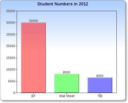 But I was in meetings where student numbers for all Group Schools were announced in late 2011, and we also know the approximate numbers for franchise schools at that point. In late 2011 there were about 6500 students at all TBI schools. (This included many dubious students at public schools in Bandung who are counted as students even thought they may only be paying a pittance each. More on this another time.) Since that time one TBI group school (TBI Malang) and 1 franchise school (TBI Semarang) have closed. Two others- Bekasi and Kelapa Gading- have low enrollments. Therefore, even if a couple of school have taken on 200 or 300 hundred new students (please provide us numbers if you have them!), TBI is still floundering around 6500. They have clearly been overtaken by Wall Street and EF leaves them absolutely in the dust. The following chart shows TBI languishing behind both EF ad Wall Street in student numbers. While the figure for TBI is only approximate, it is hard to believe they have added many students when two schools have closed and no new ones have opened.