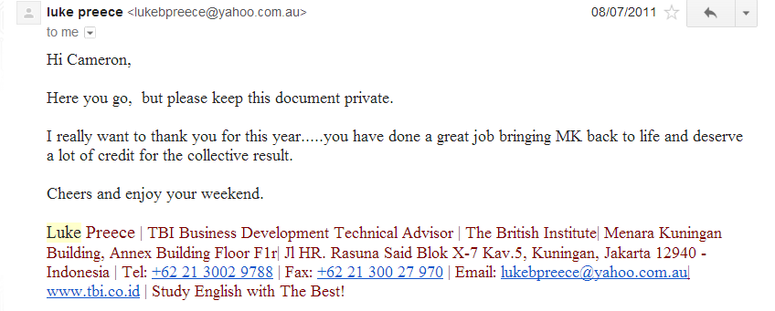 Below is a screen dump which shows Luke Preece lavishing praise on Cameron’s efforts at “bringing MK back to life” after the bad old days of Wati. As much as he tells new teachers today how terrible he was, before we started a blog exposing TBI corruption, Luke had a completely different impression of his former charge. Wonder why Luke can’t keep his story straight about anything?