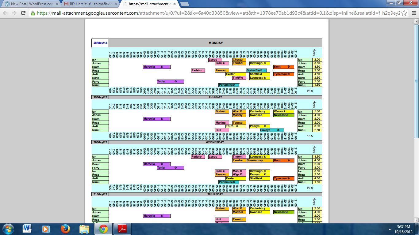 At the end of May 2012, the last expat I had hired left TBI. That was just 3 months after I finished as school manager. Nunu cleared out the whole lot of us in 3 months through sheer incompetence. This teacher broke his contract at the end of May, fed up with the shambolic management of Ashley Platts’s choice for the job- the CELTA-less, work-shy Nugraha Pratama. Just how much of a disaster Platts’s choice Nunu was can be gauged from the leaked timetable printed here (in two screen dumps). The week I left we had 130 hours of classes on the schedule. Here we find Nunu with only 93 hours of classes a mere 3 months later. In short he had lost around a third of the entire school within 3 months.