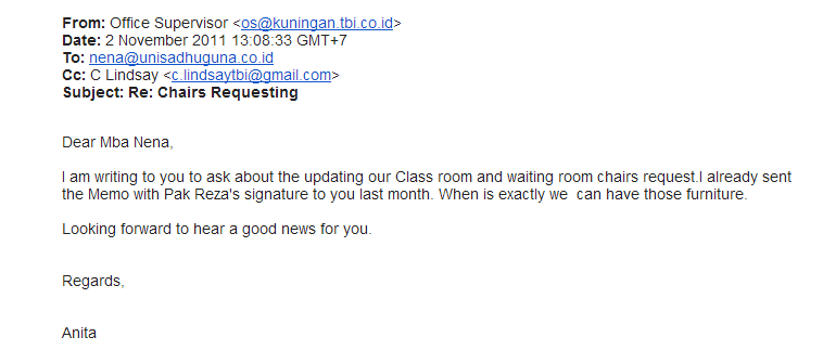 The email below is typical of TBI in important ways. It shows that TBI Kuningan had to wait months to replace a single chair. This is typical of Head Office. They are horribly bureaucratic, taking months to process simple requests for routine matters. To get any money out of them, you had to send memo after memo, email after email, and then ring them back again and again to check when it was coming. They would literally couldn’t replace a single broken chair without a whole paper trail of documents, yet they demanded instant results from school managers who were running schools starved of funds. The money is all siphoned off by the well-connected, leaving TBI students with second-rate facilities. Yet when students leave complaining of old computers and snail-paced Internet, Head Office blames the school managers. In reality, they do little besides place obstacles in the path of school managers.