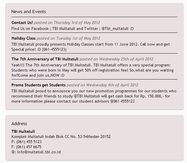 Yet the rot has only got worse with time. They haven’t opened a new branch in years, despite frequent boasting that TBI Bali and TBI Palembang were on the way, and two branches, TBI Semarang and TBI Cengkareng, have gone bankrupt. Many of their remaining franchise schools are merely shells: we call them “zombie schools”. There is no growth, no promotions, nothing happening, but they merely stumble along like the Walking Dead, going from one year to the next in a dreary, comatose state. One of the worst of the zombie schools is TBI Medan. This one has not updated its webpage for 22 months running. Pathetically and embarrassingly, they still have events from early 2012 on their “News and Events” board. It is now March 2014, but they still have latest events from April and May 2012 advertised. The management of TBI and this franchise school are so lazy that no one has updated their website for the last 680 days. Here is their 22-month old “news update”, still up on their webpage.