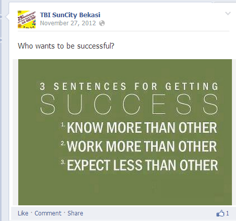 But chronic laziness isn’t the only sin on display. There are also- wait for it- tips from success from TBI! Amazing. Can’t wait to here how to achieve success from a school which last updated its Facebook page in 2012. This will be priceless! And then when you get there, you aren’t disappointed. What you find is an attempt at giving tips which is filled with grammar errors. Binsar tells us that if you want success you have to, “Work more than other.” Work more than other what, Binsar? You’ve got a wrong word there. But it doesn’t end there. The next two sentences repeat the same error! And it’s been sitting there for 570 days in its grammatically-muddled glory.