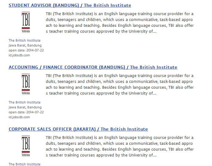 We have cut out two samples of the job ads, which give quite an impression of chaos and dysfunction in themselves; there has been another mass exodus of staff from the hapless British Institute. It seems that they have lost the following: their Finance Coordinators in both Bandung and Jakarta; their Corporate Sales officers in both Bandung and Jakarta; student advisors, on the front desk in both Jakarta and Bandung; Non-Native teachers in Bandung; an Office Supervisor in Jakarta, which is the top Admin role in the whole school, and they also need a Recruitment Officer to replace all these jobs. In that list alone, you find many of the key admin positions in both cities, and that’s only about a third of the advertised vacancies. They always lost a lot of staff due to low pay, but this is a tsunami.
