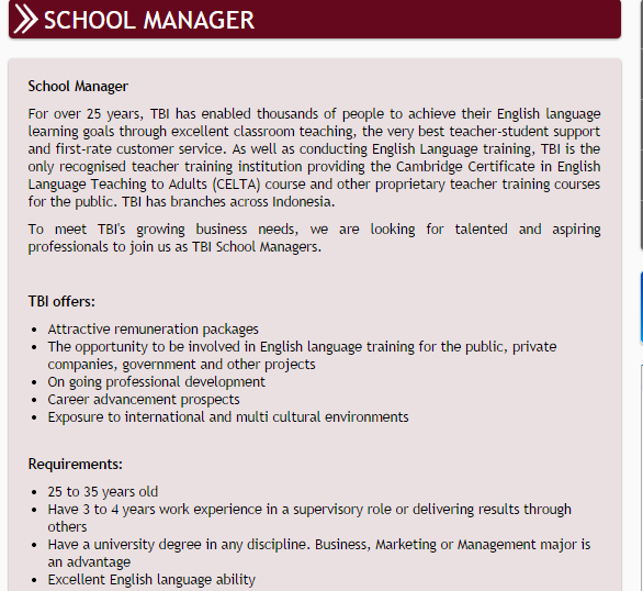 Age discrimination may not be illegal in Indonesia, and I am sure TBI would be able to find many other companies that engage in it, but our point is not that their age discrimination is illegal; we merely want to highlight that this is a choice they have made of their own free will. TBI is quite happy to advertise to the world that Indonesians in their late 30s, 40s or 50s are not welcome to apply for management positions in this company. Clearly, this is an odd situation. In 2014 the retirement age in Indonesia increased to 58 years of age and further increases are slated. If Indonesians don’t have to retire until they are 58 years old, why is TBI disqualifying managers above 35 years of age? This wasn’t the case at any of the well-respected corporations we taught Business classes at in Indonesia. Why is TBI uniquely hostile to older, more experienced managers? After all, in the corporate world management experience is usually viewed as an asset, not a liability.