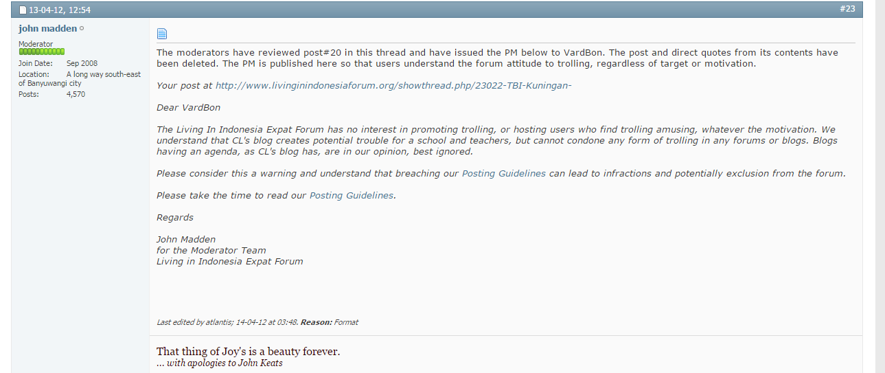 At that point the Living in Indonesia forum moderator stepped in and shut down the entire thread because a TBI employee had been caught red-handed encouraging people to ‘troll’ this blog as a way of discrediting us. Though the moderator was still not even-handed or open-minded in his approach to this case, he realized that there were people at TBI who were deliberately trying to deceive other teachers in Jakarta and he was forced to shut down a thread full of ‘trolling’. If he had thought it through, this was actually another chunk of evidence to support our argument that TBI was filled with professionals liars who deliberately set out to deceive people. While he maintained his belief that TBI was probably the wronged party, he accepted that their representatives were lying and trolling, and issued a stern warning. Here is what he wrote: