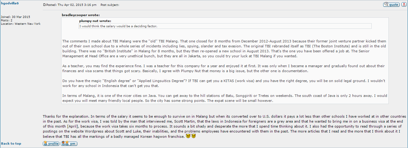 In the past few days, a teacher who TBI Malang tried to recruit has come on Dave’s ESL Cafe and alleged that Scott Martin has told him that Indonesian law is ”a grey area” with regards to employing teachers on business consultant visas. In other words, Martin has been caught red-handed lying to potential teachers during the recruitment process. His fraudulent misrepresentations of Indonesian law would amount to conspiracy to defraud in Australia, and I do not hesitate to say that he has broken numerous Indonesian laws too. This is yet more evidence that TBI is an unethical and illegal company which routinely deceives and misleads the TEFL teaching community.